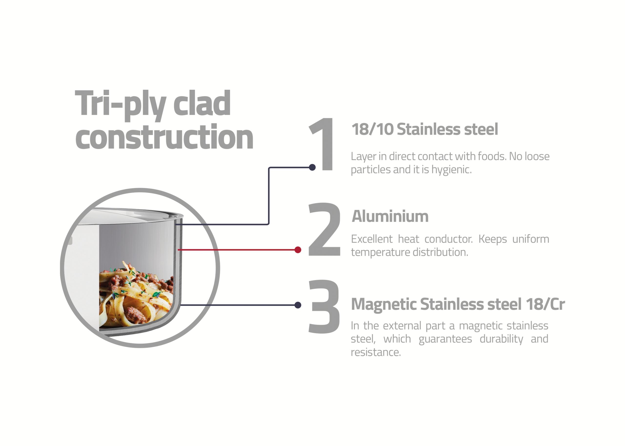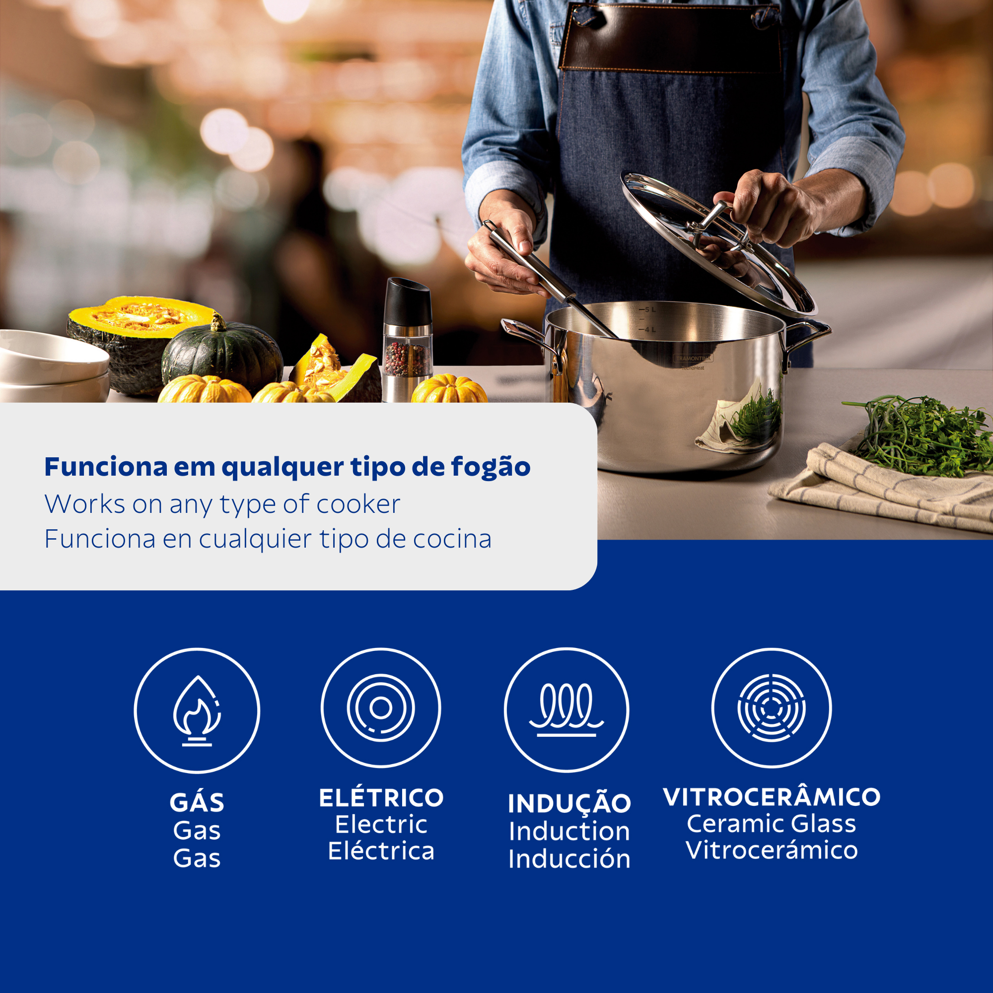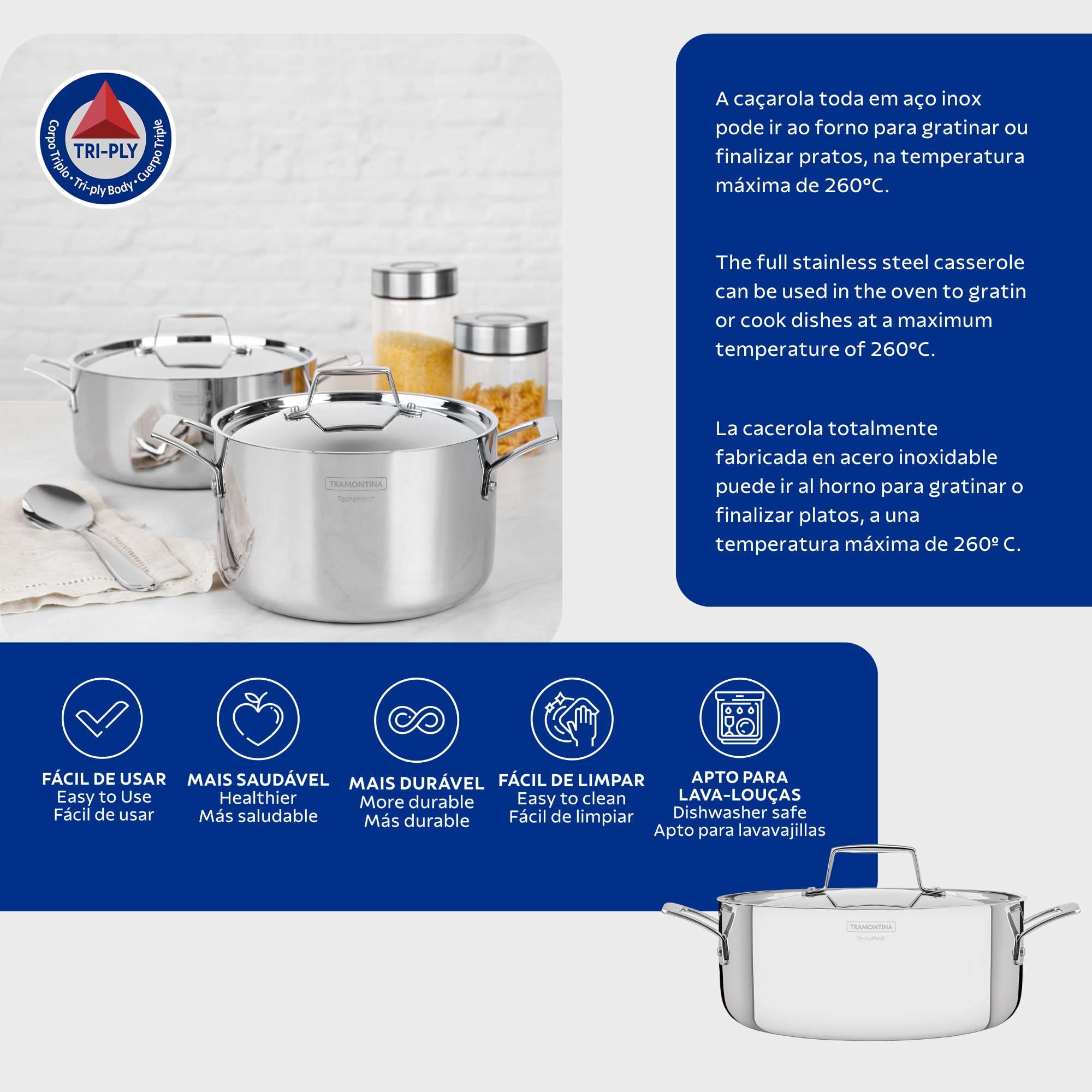 Healthier: as it is made of stainless steel, the Tramontina casserole does not release any residue in your food. Easy to use: a practical casserole for all your recipes that does beautifully well on any type of cooker: gas, electric, glass ceramic, or induction. It also features a lid with steam vent that fits perfectly. More durable: Tramontina’s stainless steel is a high quality raw material, highly resistant, and does beautifully well for much longer in the kitchen. Saves time and energy: the secret is the triple body (stainless steel + aluminum + stainless steel), which distributes the heat evenly for faster cooking. This is why you can keep the heat low while cooking, which saves energy. What is more, the full stainless steel casserole can be used in the oven to gratin or cook dishes at a maximum temperature of 260°C. Easy to clean: it is quite simple to have a spotless casserole. All you need is water, soap, and a soft sponge. If you prefer, you can simply put it in the dishwasher.