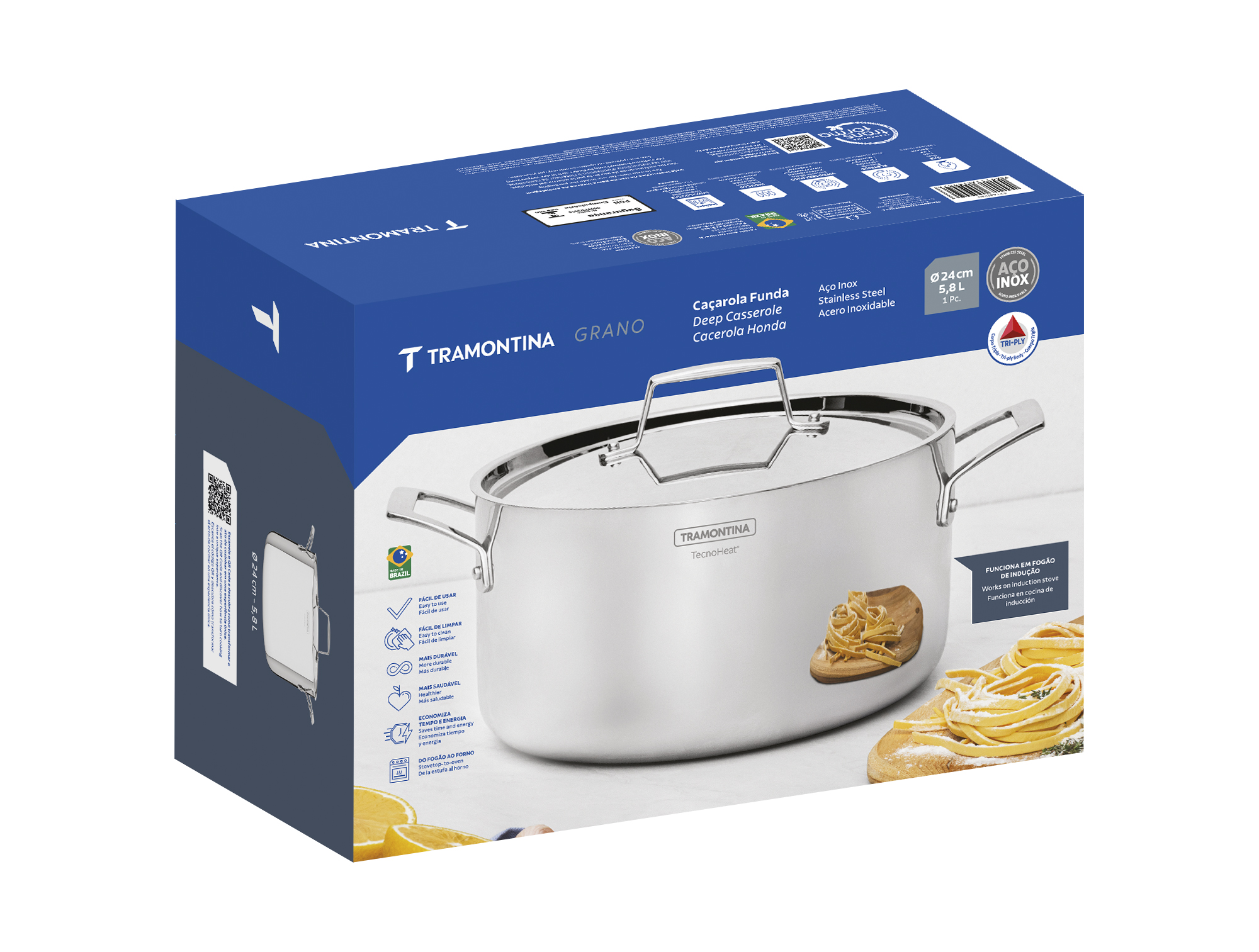 DescriptionTramontina Grano 24 cm 5,8 L stainless steel deep casserole dish with tri-ply body, lid and handles