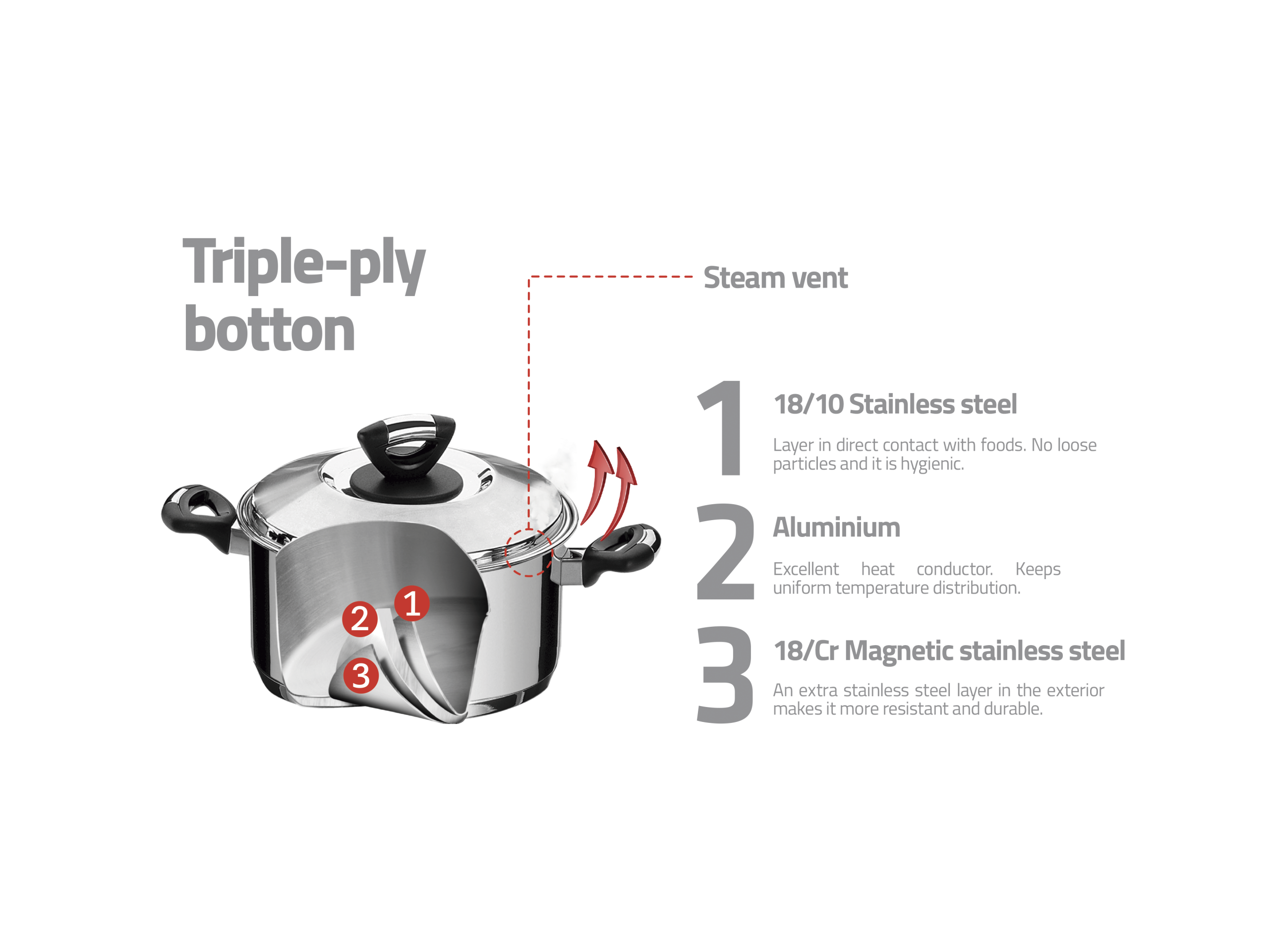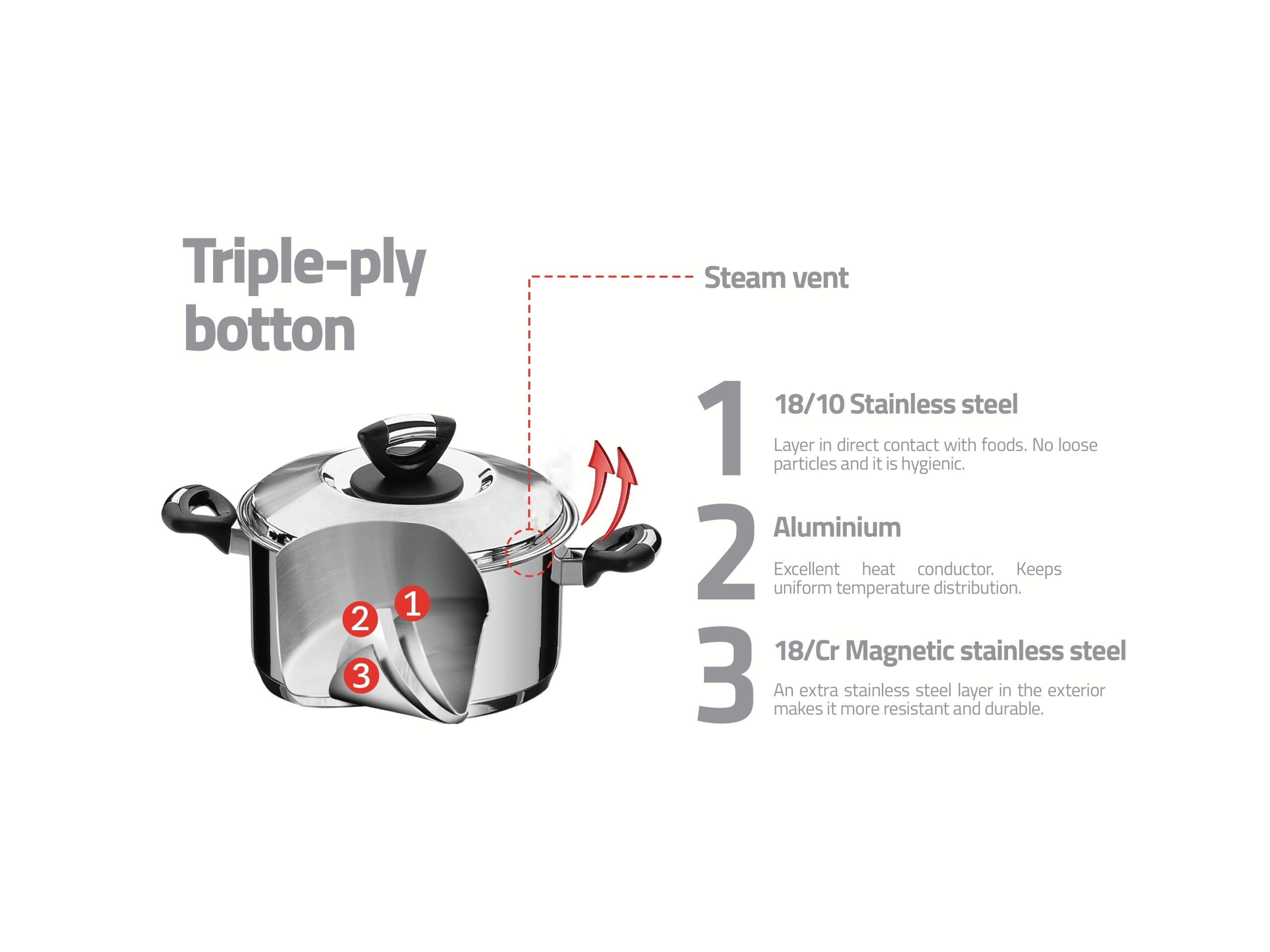 Healthier: as it is made of stainless steel, the Tramontina pan does not release any residue in your food. Easy to use: a practical pan for all your recipes that does beautifully well on any type of cooker: gas, electric, glass ceramic, or induction. It also features a lid with steam vent that fits perfectly. Bakelite handles and holders are heat-resistant, flame proofed and will not burn when the flame is not centralized under the pan. More durable: Tramontina’s stainless steel is a high quality raw material, highly resistant, and does beautifully well for much longer in the kitchen. Saves time and energy: the secret is the three-ply bottom (stainless steel + aluminum + stainless steel), which distributes the heat evenly for faster cooking. This is why you can keep the heat low while cooking, which saves energy. Easy to clean: it is quite simple to have a spotless pan. All you need is water, soap, and a soft sponge. If you prefer, you can simply put it in the dishwasher.